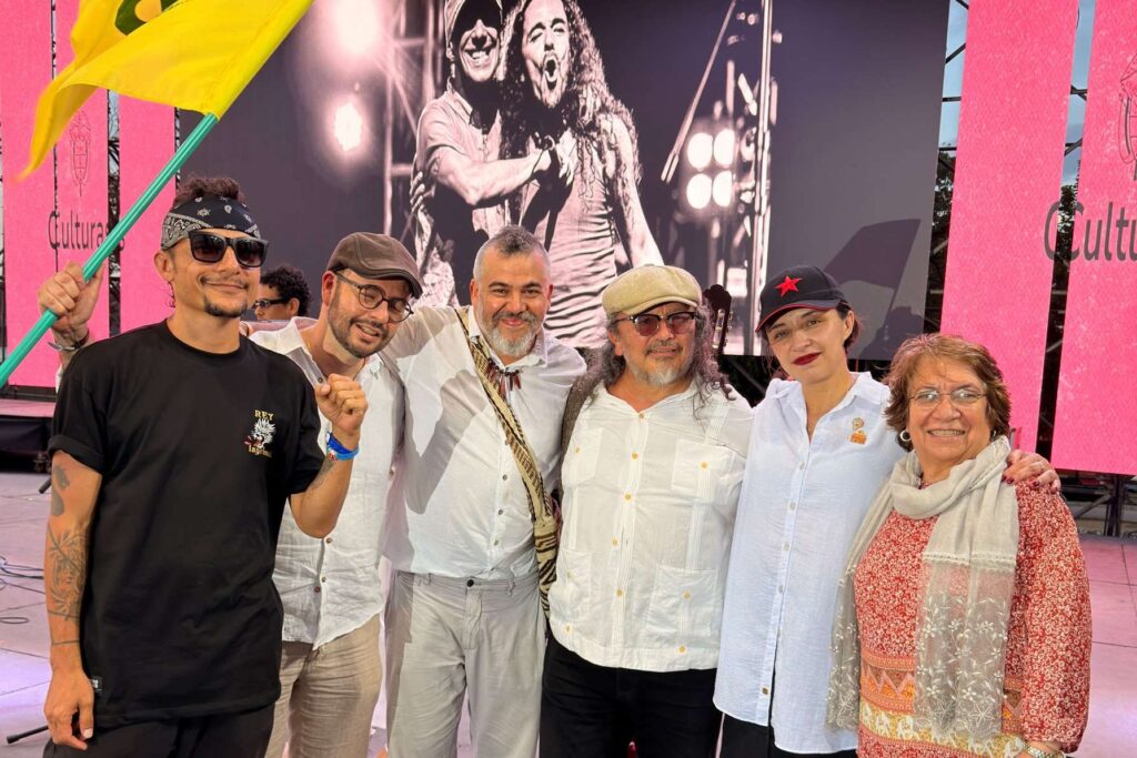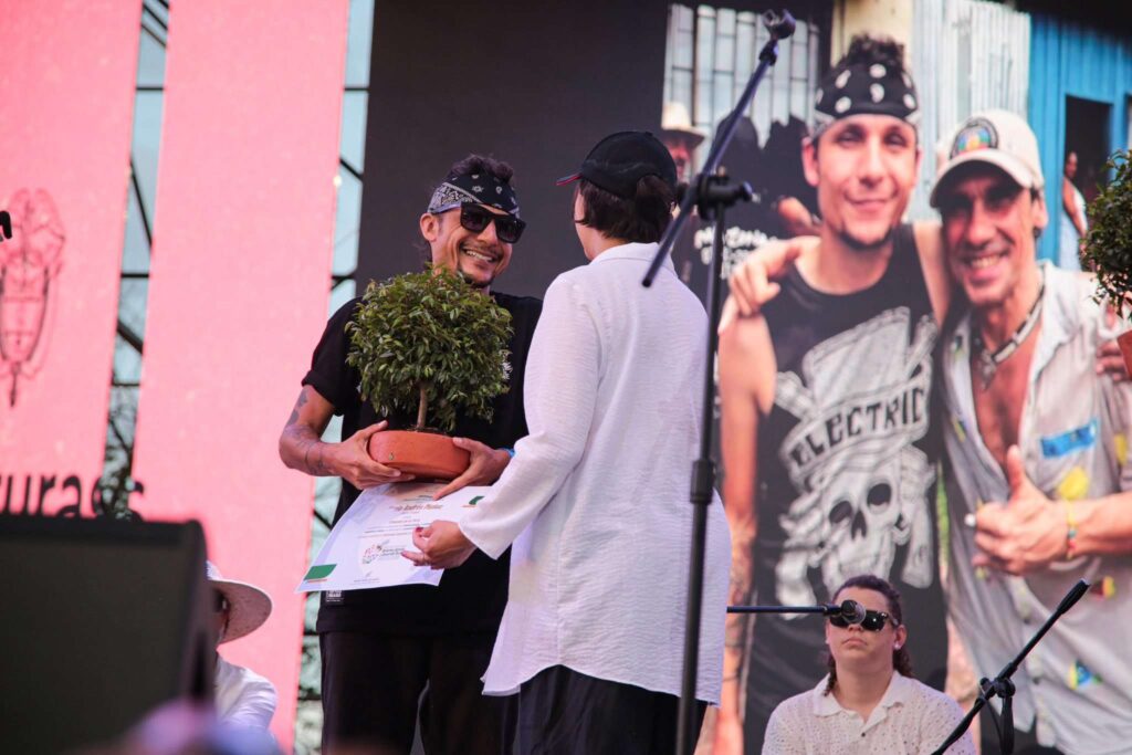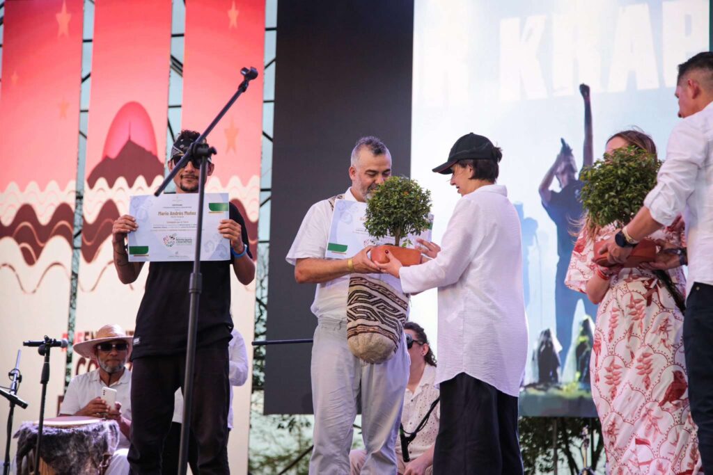 Durante el evento “Raíces de la dignidad: memoria viva de las luchas agrarias de la Unión Patriótica”, la Ministra de Agricultura y Desarrollo Rural de Colombia, Martha Carvajalino, hizo entrega del reconocimiento como “Embajadores por la Tierra” a Mario Muñoz (Subcantante) y David Jaramillo (David Kawooq).