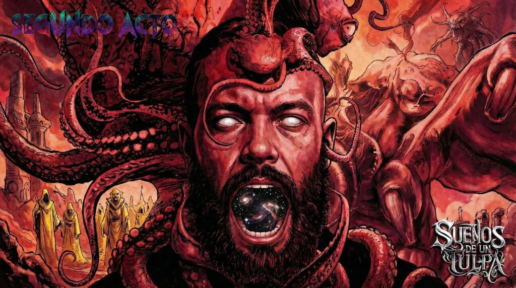 ‘Segundo acto’ es lo nuevo de Sueños de un Tulpa, es la materialización sonora de la maldición descrita en El Rey de Amarillo de Robert W. Chambers. En esta obra ficticia, el Primer Acto es una trampa de aparente normalidad, una introducción inofensiva que baja las guardias del lector; sin embargo, el Segundo Acto revela verdades universales tan terribles que la mente humana colapsa al leerlas. En la canción, la voz es de un invocador iluso que demanda saber la verdad, creyéndose digno de portar la ‘omnisciencia cósmica’ del Rey de Amarillo. La historia explora el terror de la incomprensión: el momento exacto en que la ambición se convierte en ‘exterminio total’. Habla de la fragilidad humana ante lo primigenio; de cómo, al intentar someter fuerzas más allá de nuestro entendimiento, terminamos siendo nosotros los sacrificios de un horror que no tiene nombre.